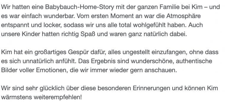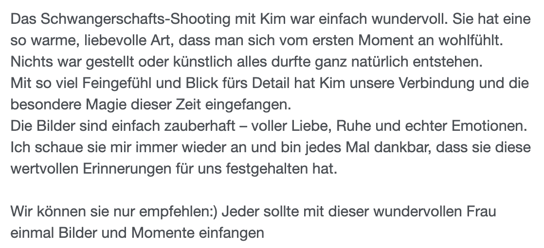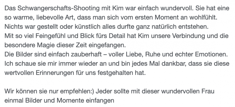 „Wahnsinn, ich bin sooo glücklich mit meinen Schwangerschaftsbildern! Kim ist nicht nur auf all meine Wünsche eingegangen, sondern hat sie übertroffen. Ihre herzliche & einfühlsame Art haben es mir so leicht gemacht, mich komplett fallen zu lassen. Da ich selbst Fotografin bin, ist das oft gar nicht so einfach & ich würde behaupten ich bin da sehr anspruchsvoll – daher eine absolute Herzensempfehlung!“ – Klara