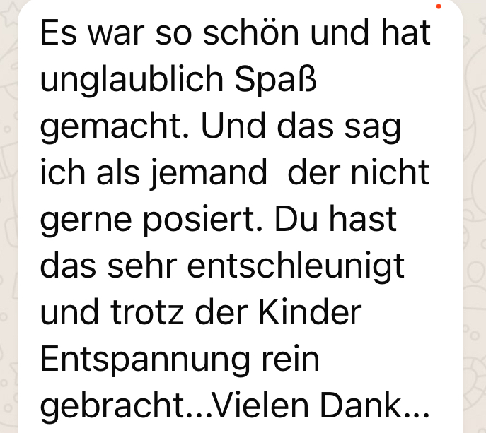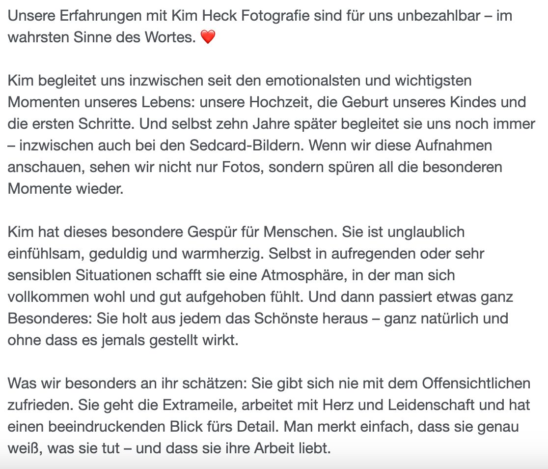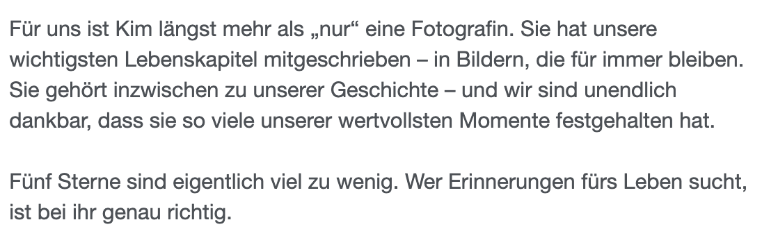 „Liebe Kim, es war ein wundervoller Abend mit dir! Vielen Dank für deine Zeit, interessant Gespräche, viele Lacher und vor allem die super schönen Erinnerungen in Form der Bilder. Du hast die Momente einfach perfekt eingefangen ❤️ wir wollten keine 0815-Familienbilder – und die haben wir auch nicht bekommen!“
